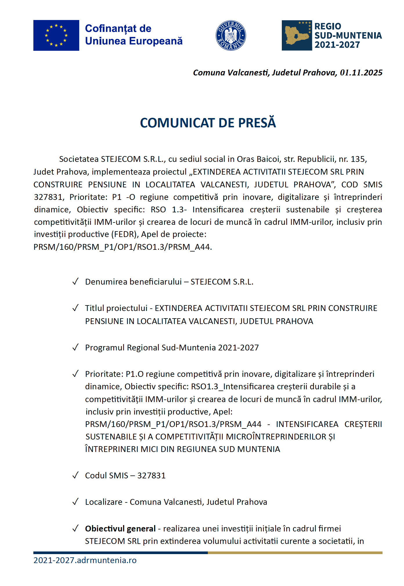 COMUNICAT DE PRESĂ: „EXTINDEREA ACTIVITATII STEJECOM SRL PRIN CONSTRUIRE PENSIUNE IN LOCALITATEA VALCANESTI, JUDETUL PRAHOVA”